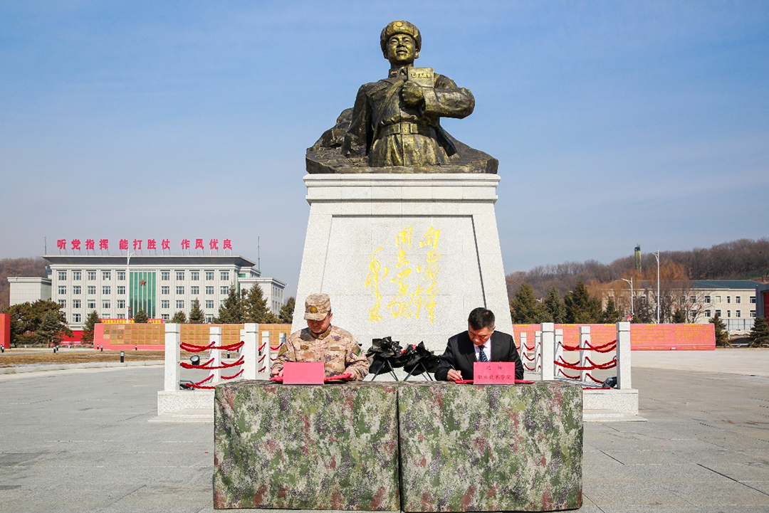 签约仪式在雷锋文化体验广场隆重举行。学校党委副书记夏宗光与31699部队副政委沈青龙共同为沈阳职业技术学院爱国主义教育社会实践育人基地揭牌,并签署共育共建协议。