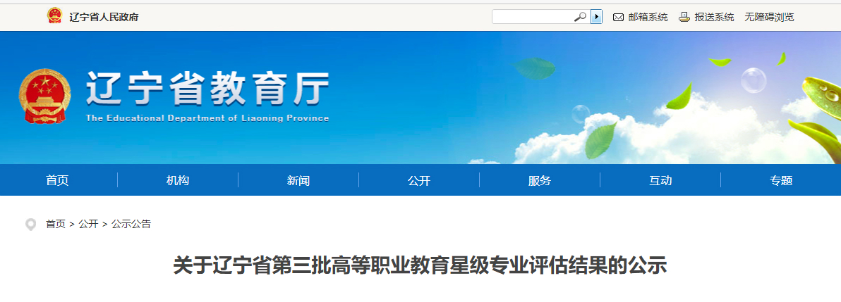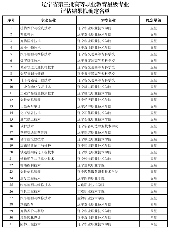 根据辽宁省教育厅《关于开展第三批高等职业教育星级专业评估工作的通知》(辽教通〔2024〕372号)要求,经材料审核及专家入校考查等程序,现对第三批高等职业教育星级专业评估结果予以公示,具体名单见附件。