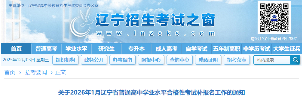 2026年1月辽宁省普通高中学业水平合格性考试报名工作已于2025年11月26日结束。为满足考生需求,经研究决定组织一次补报名,现将有关事项通知如下: