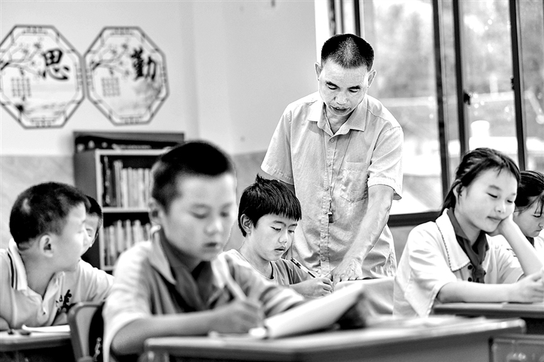 在湘黔两省边界的湖南省花垣县边城镇磨老友谊小学,乡村教师任达兵给学生辅导功课。新华社发