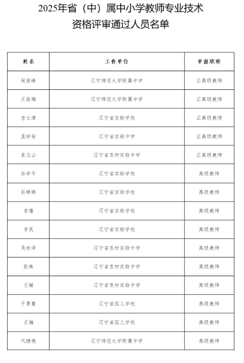 现将2025年省(中)属中小学教师专业技术资格评审通过人员名单进行公示。公示时间:2026年3月12日至3月18日,公示期内如对通过人员有异议,请在3月18日17:00前,通过电话、信函向辽宁教育学院组织人事部反映。反映问题要实事求是,电话、信函举报应告知或署真实姓名和工作单位。信函举报有效时间以发信时的当地邮戳为准。