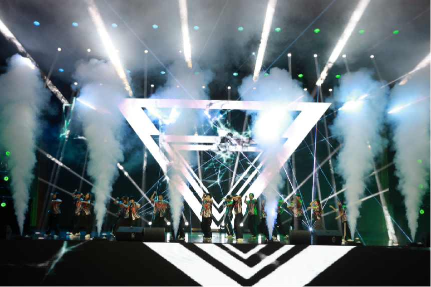 迎新晚会在激光秀中拉开帷幕,熠熠生辉的光影中,呈现出“奔跑”“跨域”的意向主题,以科技与艺术交融的特别创意,以奔跑者跨越“时间”为题,记录了学校建校以来的重要历史节点,展示了学校77年建设与发展的历史足迹,勾勒出学校始终与党和国家同呼吸、共命运,忠心育人、青锋报国的赤子情怀,燃起全场的热潮。