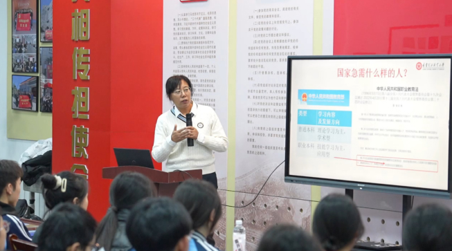 崔莉芳教授以《强国有我,技能报国》为题,从国家积极支持职业本科教育发展、新修订的《中华人民共和国职业教育法》明确职业教育与普通教育具有同等重要地位等角度进行阐述,为学生拓宽视野、明晰生涯规划方向提供了有力指导,激励广大高中学子厚植家国情怀,树立“技能报国”的理想与信心。