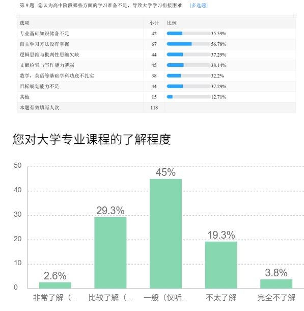 为更加精准地把握高中-大学衔接阶段存在的核心痛点与现实教育需求,实践团开展了一套系统性、多层级的调研工作,构建起“问卷调研——深度访谈——集中研讨”三位一体的完整调研体系。在问卷设计环节,团队紧密结合衔接教育的关键议题,分别面向辽宁师范大学附属中学的高中生与社会在校大学生设计了两套针对性问卷。问卷内容涵盖知识衔接、能力培养、心态适应、规划认知等四大维度,共设置20余个具体问题,包括高中学习习惯、大学适应难点、专业认知清晰度、未来发展方向等重要方面。本次调研共计回收有效问卷500余份,依托专业的数据统计与交叉分析方法,清晰揭示出衔接教育中存在的典型问题:有近70%的高中生对大学专业课程设置与内容安排缺乏基本了解;超过50%的大学生认为自己在高中阶段缺乏自主学习能力的系统训练,这成为他们进入大学后适应困难的主要障碍。