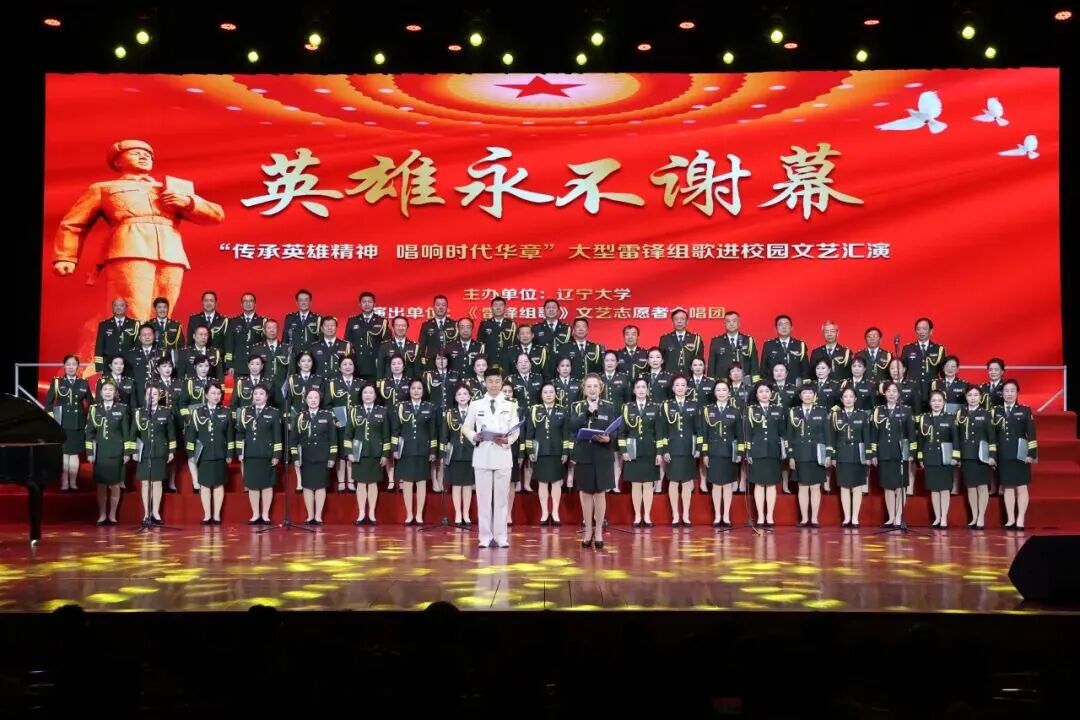 雷锋组歌《永不陨落的星》演出阵容强大,表演温暖动人。合唱团成员包括原沈阳军区前进文工团军休干部、知名艺术家、全国人大代表及沈阳市主流合唱团成员,全员为文艺志愿者,其中年龄最长者年过花甲,最小者仅8岁。他们以真情唱响时代强音,用歌声播撒雷锋精神种子,让雷锋精神在辽大校园落地生根。