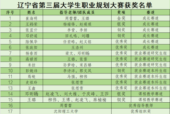 近日,第三届全国大学生职业规划大赛辽宁赛区决赛暨辽宁省第三届大学生职业规划大赛决赛胜利收官。沈阳理工大学斩获金奖1项、银奖2项、铜奖3项、优秀奖8项,以及优秀指导教师及优秀组织奖等优异成绩,创下该校自参加该项赛事以来的历史最佳成绩。学校党委副书记张树东、招生就业处负责人、获奖教师和学生代表出席了大赛闭幕式。