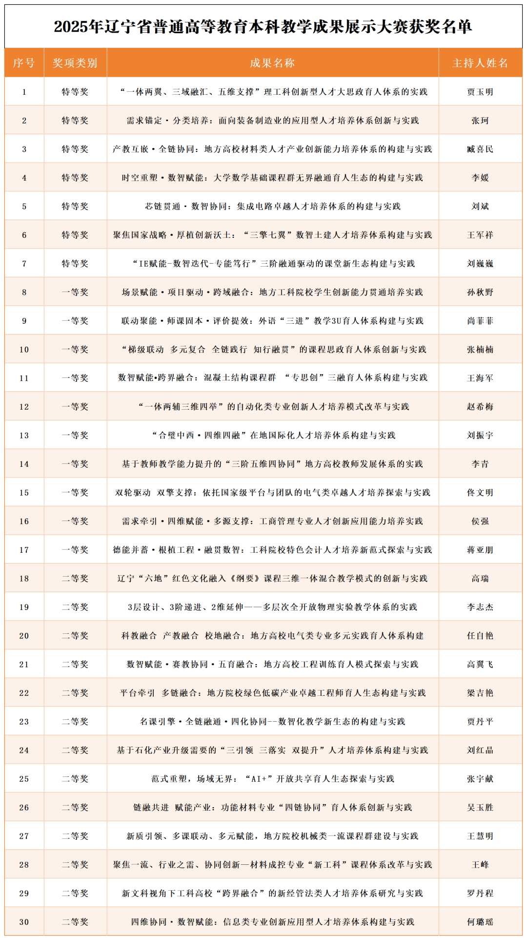 近日,2025年辽宁省普通高等教育本科教学成果展示大赛获奖成果名单公布,沈阳工业大学斩获30项奖项,其中特等奖7项、一等奖10项、二等奖13项。获奖总数及各等次奖项数量均居省属高校前列,充分彰显学校本科教学建设的强劲实力。