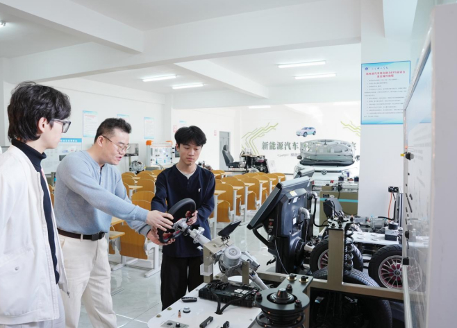 按照“专业链对接产业链”的思路,学校系统构建了覆盖新能源汽车全链条的专业集群:上游研发端设有新能源汽车工程、智能科学与技术、工业软件开发技术等专业;中游制造端布局智能制造工程、机器人工程、焊接技术与工程、电气工程与智能控制等专业;下游服务端开设汽车服务工程、物流工程、电子商务等专业。今年2月,学校又成功获批工业软件开发技术专科专业,进一步补强了“智能制造的大脑”这一关键环节。