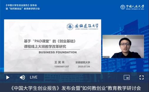 7月4日,由中国人民大学、中国高等教育学会创新创业教育分会联合主办的《中国大学生创业报告》发布会暨“如何教创业”教育教学会举行,安徽建筑大学的王昊禾老师受邀作为代表,在该会的“抗击疫情与创新创业教育”分论坛上,以“基于‘PAD课堂’的创业基础课程线上大班教学改革研究”为题,分享了其在创新创业教育领域的成功经验。