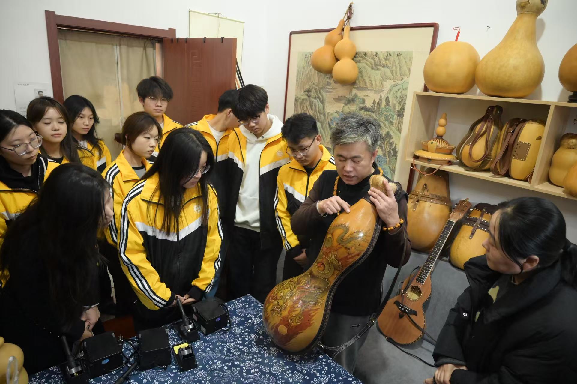 现场,陈老师展示了诸多匠心独运的作品,其中由剖片串成的葫芦小风琴,轻推间流淌出清越声响;塑形缠绳的葫芦背包,烙印着温暖的烫纹。每一件作品,都让同学们直观地感受到,非遗并非博物馆中冰冷的“老物件”,而是充满生命力与温度的、可感可触的“活态文化”。